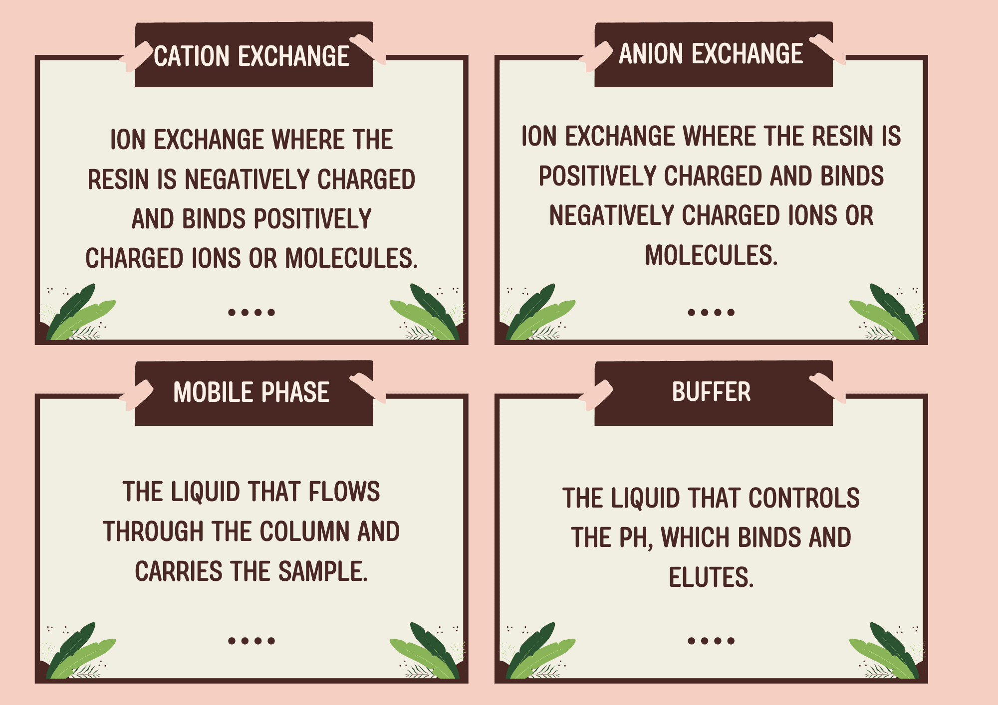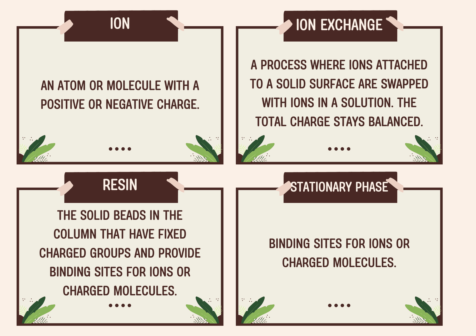 Vocabulary list (ion, resin, mobile phase, gradient, elution profile, and more) written at a high school level