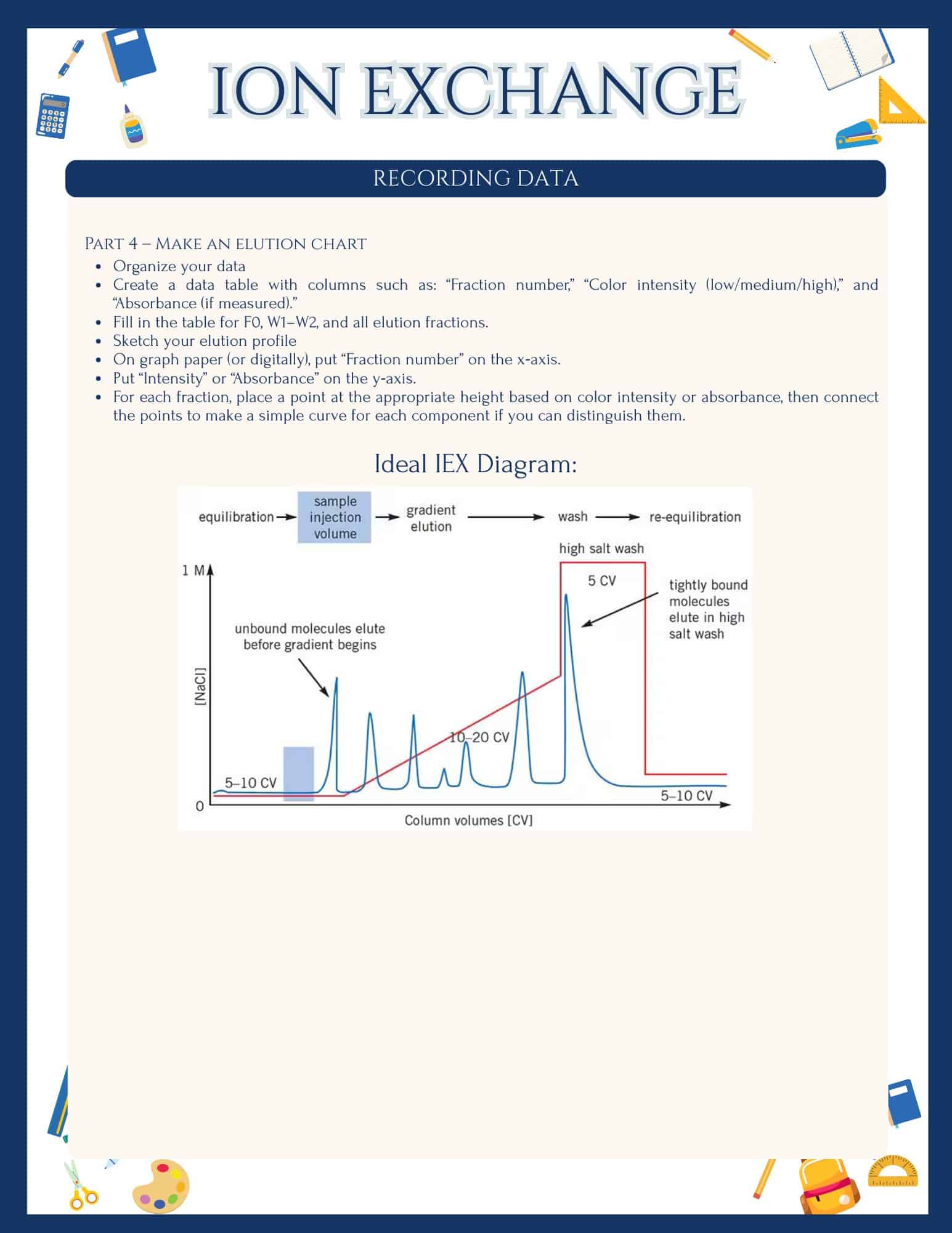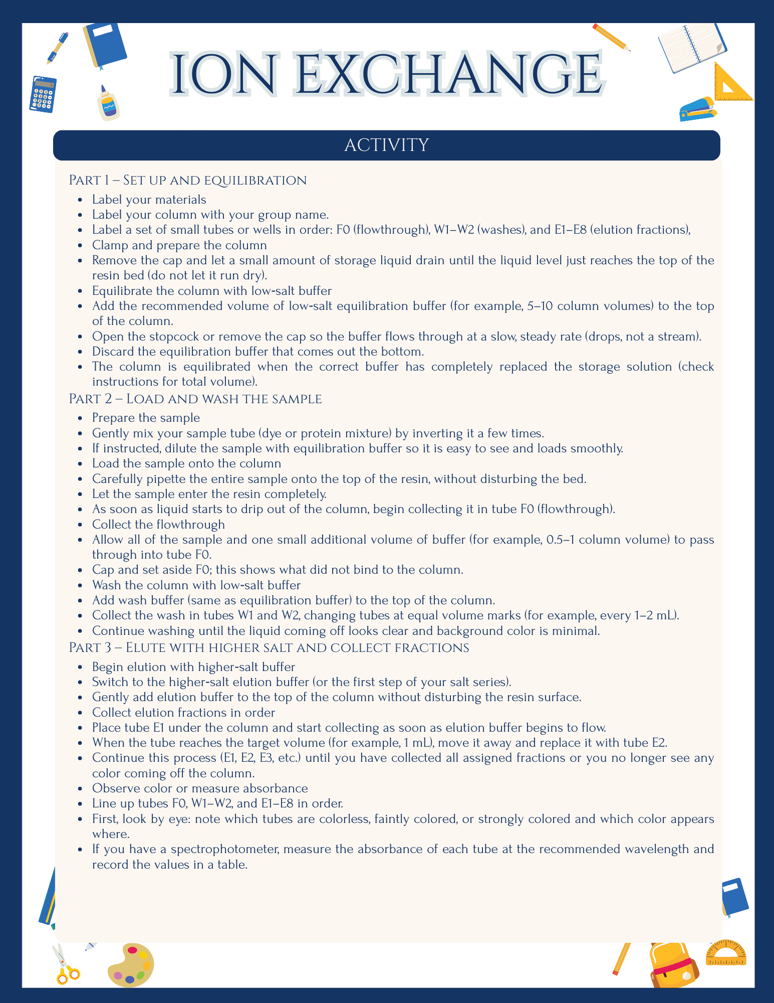 This Ion Exchange Chromatography Lab gives high school learners a first “real lab” experience beyond marker‑on‑paper chromatography. Students equilibrate a column, load a sample, wash, then elute with higher salt to watch different components come off at different times. Along the way, they see how invisible electrical charges control which molecules bind, which pass through, and how scientists use that behavior to separate and purify important substances.