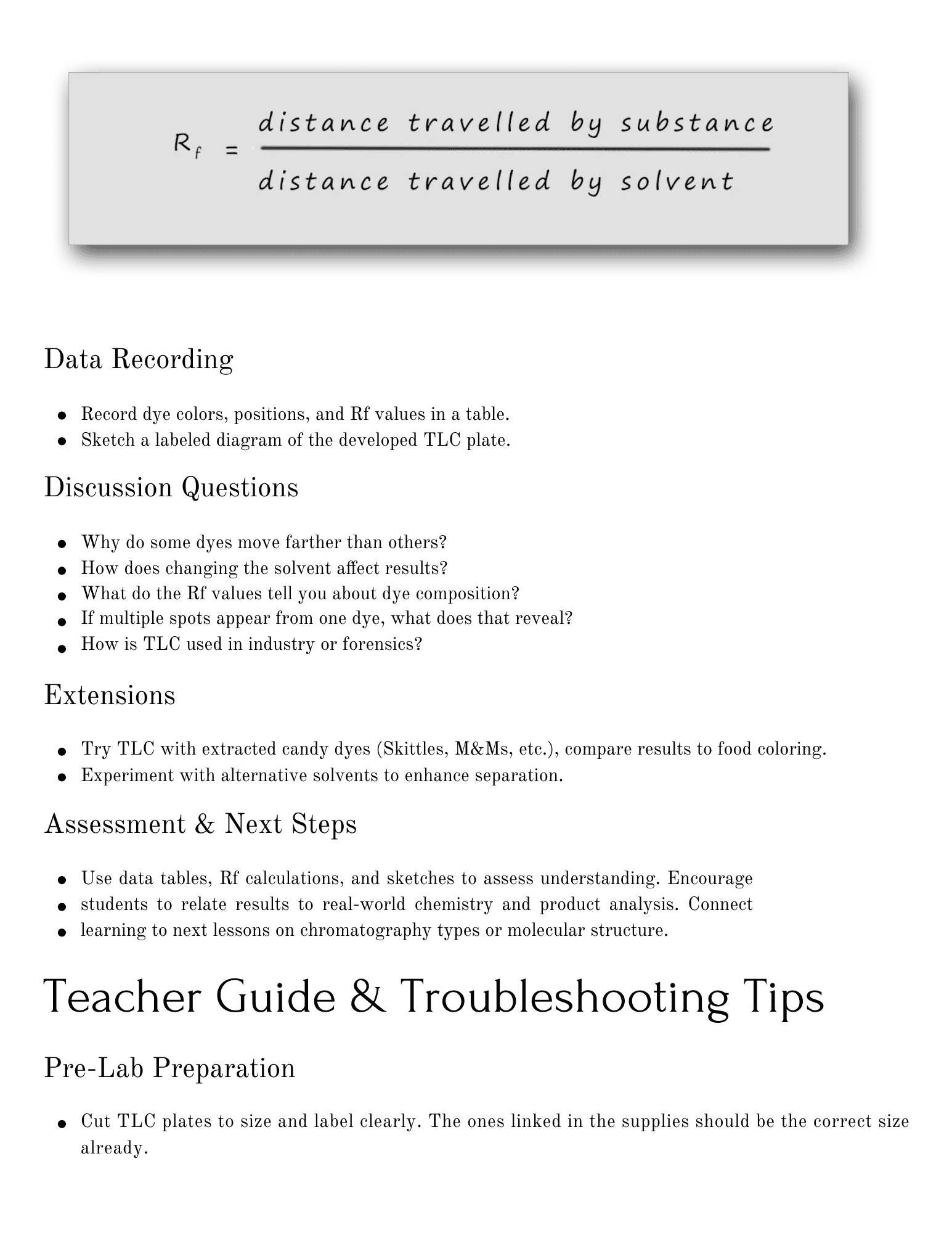 The first pages of the lesson plan are the teachers guide. This includes the step-by-step procedure on how to do thin-layer chromatography along with the teacher’s notes. Also included are discussion questions, trouble shooting tips, and guidance to help students understand what they are looking at.