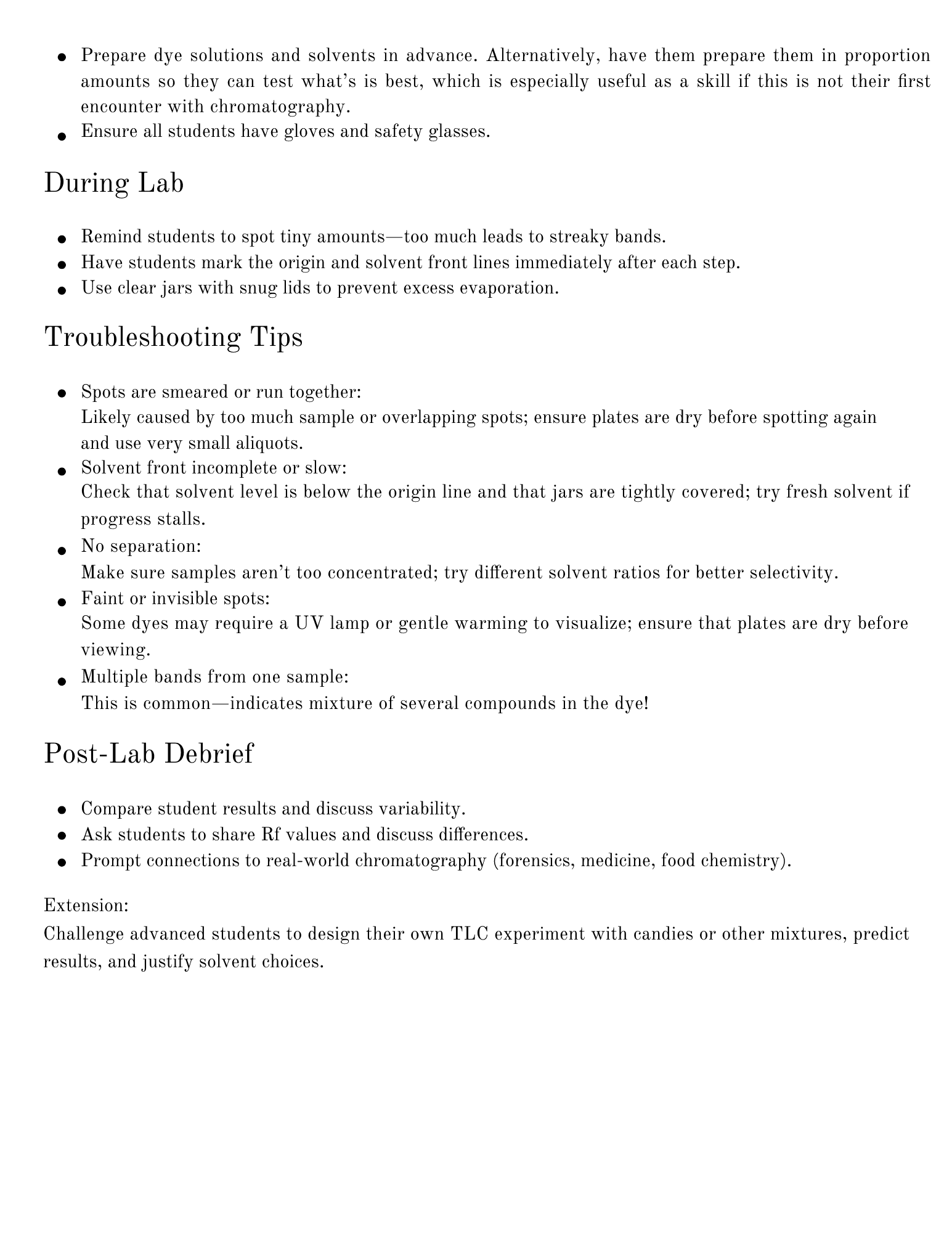 Finally, if you want to see other methods of chromatography, you can visit this blog post and click through the series for ideas and potential lesson plans to add to your school binder. Thin-layer chromatography is just the start of your journey.